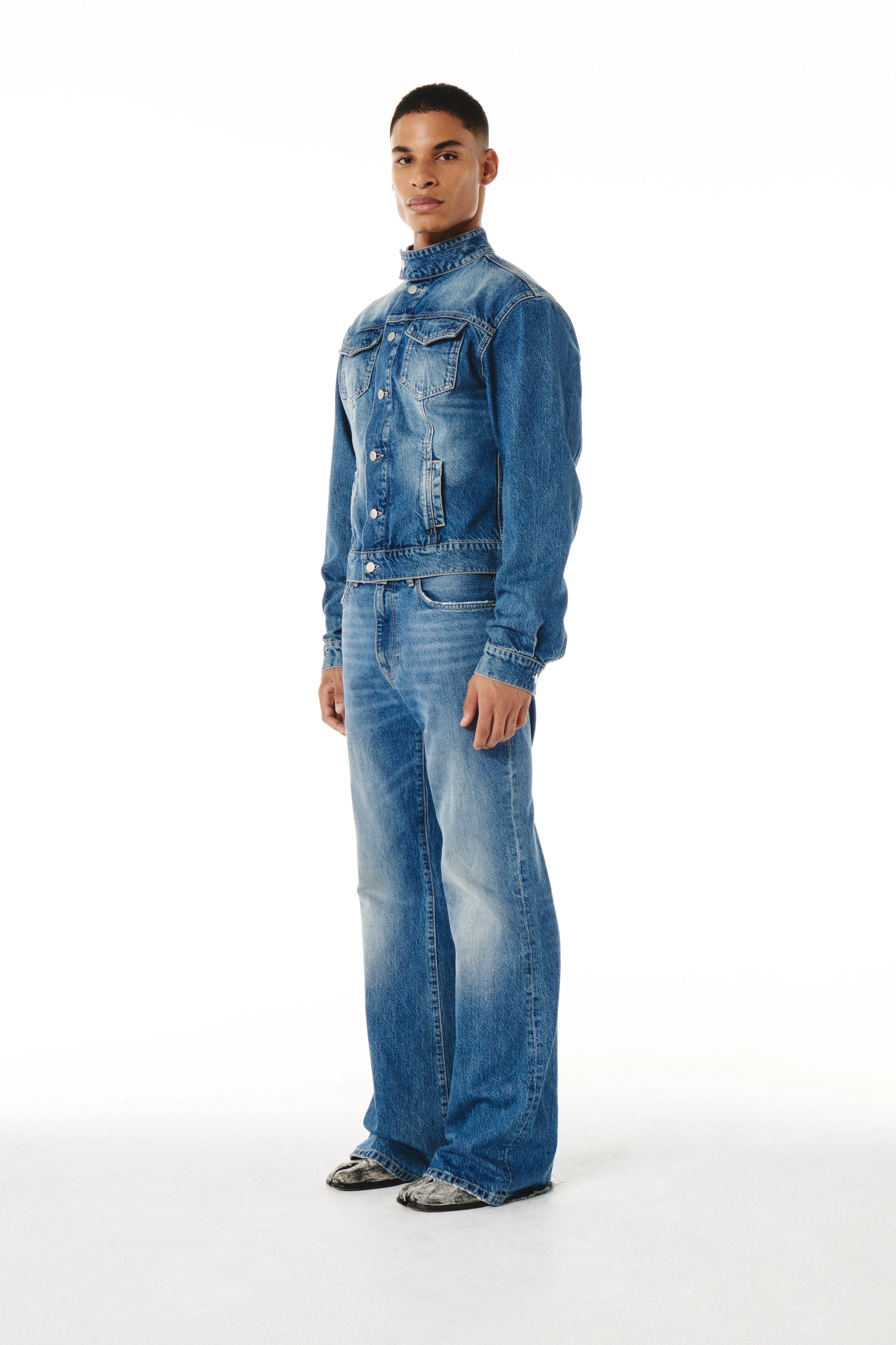 The Orion jacket is crafted from 100% cotton in a mid blue denim wash. It features strong shoulders, a funnel neck and slim waist.